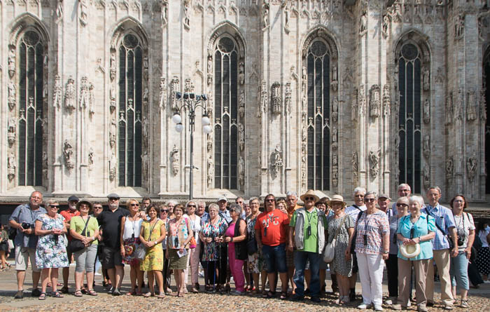 Am dritten Tag stand dann der Besuch des Dom-Innenraums als erstes auf dem Programm. Der Dom ist das wichtigste Bauwerk der Stadt und die größte Schöpfung, die die Gotik in Italien hervorgebracht hat. Außerdem ist er das weltgrößte Marmorbauwerk überhaupt und der drittgrößte Kirchenbau (nach dem Petersdom und der Kathedrale von Sevilla). Die Dimensionen sind einfach riesig: rund 40.000 Menschen haben hier Platz. Diese Größe und auch die prachtvolle Innenausstattung beeindrucken jeden Besucher. Weiter ging es dann zur „Galleria Vittorio Emanuele II“, einem mit Glas überdachten Einkaufszentrum, welches Ende des 19. Jahrhunderts erbaut worden ist. Wer zu viel Geld hat, der kann hier bei Prada, Gucci, Chanel oder Vuitton seinem Geldbeutel eine Schlankheitskur verpassen. Leider musste – wegen unangekündigter Schließung - eine geplante Führung im weltberühmten Opernhaus „Scala“ abgesagt werden. Dafür entschloss man sich kurzfristig, die Grabstätte von Giuseppe Verdi zu besichtigen und einen Abstecher zum Giuseppe-Meazza-Stadion (früher „San Siro“) einzulegen. Zur Mittagspause ging es dann weiter in das malerische Stadtviertel Navigli, das noch von einigen Kanälen des einst weitverzweigen Kanalsystems Mailands durchzogen wird. Beiderseits der Kanäle laden kleine hübsche Lokale und Restaurants zum Verweilen ein. Nach der Pause ging es dann zum Monumentalfriedhof, einem gewaltigen Freilichtmuseum mit Statuen, Obelisken, Tempeln und vielen eindrucksvollen und äußerst ungewöhnlichen Grabgestaltungen.