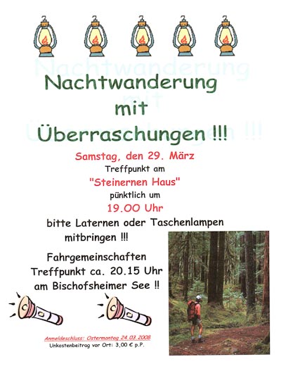 Pünktlich zur erstmals angesetzten Nachtwanderung des Bürgerverein Grabengärten am vergangenen Samstag stellte sich herrlichstes Wanderwetter ein, so dass sich 20 Mitglieder und Freunde des Vereins voller Erwarten gegen 19 Uhr am Steinernen Haus auf die Wanderführer Walter Wirth und Marina Schuster warteten. "Bewaffnet" mit Laternen und Taschenlampen machte man sich auf den ca. 5 km langen Weg zum Ziel am Bischofsheimer See. Über die Schmachtenberger Steige, die so manchen "Flachland" -Grabengärtler den Schweiß auf die Stirn trieb, ging es über die Höhenzüge des Kapellenberges immer weiter Richtung Bischofsheimer Wald. Schon auf den Höhenrücken zog es die Wandergruppe weit auseinander, welches besonders bei der anbrechenden Dunkelheit durch die mitgeführten Lampen beobachtet werden konnte. Durch den Wald ging es dann wieder bergab zum Bischofsheimer See. Tausende von Sterne leuchteten, vom absolut wolkenfreien Firmament herab und so mancher Hobbyastronom erklärte den Wanderern die zu sehenden Sternbilder. Am Ziel angekommen, wartete dann das nächste eindrucksvolle Bild auf die Teilnehmer. Durch den Lichtschein, der vielen aufgestellten brennenden Baum und Gartenfackeln, welcher sich auf dem glatten Wasser der Seeoberfläche spiegelte, wirkte das Grillpavillon, mit der pechschwarzen Nacht als Hintergrundbild, wie ein Märchenschloss; In diesem Schloss wurden die Wanderer mit einem Willkommenstrunk, von vielen mit dem Auto "angereisten" Mitglieder, erwartet. Jedoch auch der Hunger sollte nicht zu kurz kommen. Vereinsmitglied Gerold Säger, nebenberuflich 3-Sterne-Internetkoch, konnte mit seinem "Chefbrater" Klauer Paul wahre Köstlichkeiten vom Grill kredenzen. Neben saftigen Steaks und Bratwürsten gab es noch gegrillte vegetarische Spieße in den verschiedensten Variationen, dazu gegrilltes Knoblauchbrot und andere schmackhafte Kleinigkeiten. Dies alles ließ wahre Gaumenfreuden aufkommen. Durch die aufkommende Nachtkälte zogen sich alle anwesenden Grabengärtler dann immer mehr in das warme Pavillon zurück und waren auch einem, von Monika Rambacher servierten, wärmenden Schluck aus der Schnapsflasche nicht abgeneigt. In der Gewissheit, eine schöne und gelungene Nachtwanderung des Vereins miterlebt zu haben, machten sich viele Grabengärtler erst recht spät wieder auf dem Heimweg, wobei es sich einige nicht nehmen ließen, diesen wieder zu Fuß anzutreten. Die Vorstandschaft würde sich freuen, zu unserem nächsten Wandertermin am 1. Mai ebenso viele Mitglieder und Freunde des Vereins an der Vereinsunterstellhalle begrüßen zu können und bedankt sich nochmals bei den Organisatoren, die diesen Abend mit viel Phantasie und Engagement vorbereitet haben.