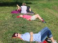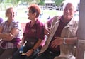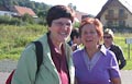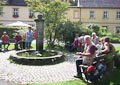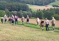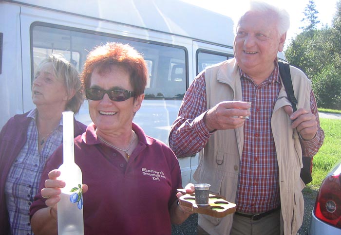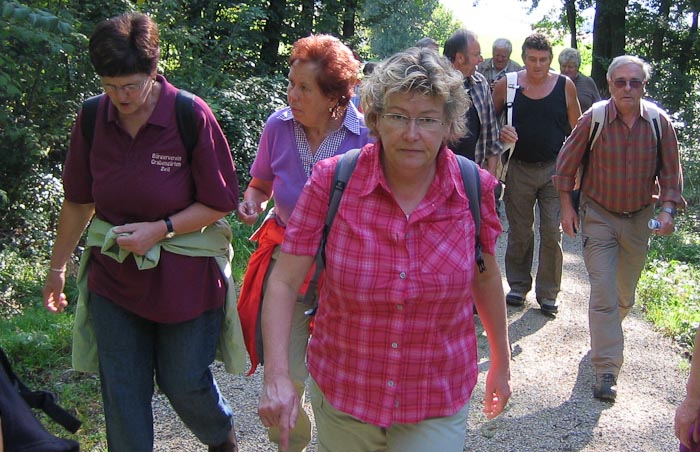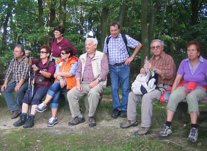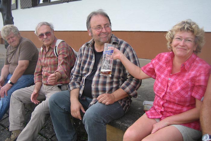 Die Rucksäcke waren noch nicht alle auf den Schultern, da gab es von Gisela (Brech) bereits eine Runde Geburtstagsschnaps. Danach wurden die ca. 12 km unserer Wanderstrecke angegangen. Der Weg führte sanft bergauf. Rechts und links abgeerntete Felder. Trotz des Sonnenscheins sah man, dass der Herbst des Jahres nicht mehr fern ist.Nach einiger Zeit erreichten wir unter riesigen Eichen den früheren Gerichtsplatz des Klosters Langheim. Hier wurden in alter Zeit alle anfallenden Auseinandersetzungen verhandelt und Recht gesprochen. Danach führte unser Weg durch den Wald. Teilweise auf weichen Matten machte es richtig Spaß zu gehen. Um die Mittagszeit wollten wir 19 Grabengärtler dann unsere mitgebrachte Brotzeit verzehren. Dazu war ein Platz unter Bäumen mit Tisch und mehreren Bänken ausersehen. Jedoch als der Platz für uns sichtbar wurde, welch ein Schreck: Es war bereits eine Gruppe mit ca. 15 Leuten da, die genau wie wir hier Brotzeit machen wollten. Nach dem ersten Schreck sprach unser Wanderführer Werner (Kühl) die Leute an. Und zwar mit "Hallo Leute, so geht das aber nicht, wir haben bereits vor 14 Tagen diesen Platz für uns reservieren lassen, sie können sich also nicht so breit machen." Man hat sich arrangiert, und einige Plätze frei gemacht. Die Gruppe kam, wie sich herausstellte, vom Untermain aus Haibach. Nachdem verschiedene Gedanken und Spirituosen ausgetauscht waren, zogen die Haibacher Wanderer weiter. Jetzt kamen Dagmar (Klauer), Elfi (Wirth), Martina (Schuster) und Gisela (Brech) auf die Idee, ein Heubad zu nehmen, wohlgemerkt kostenlos. Auf der Wiese nebenan lagen Heuhaufen, und darauf wurde es sich bequem gemacht.