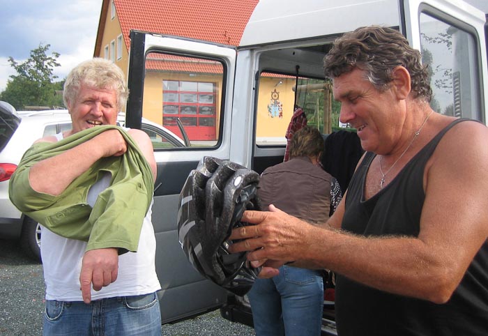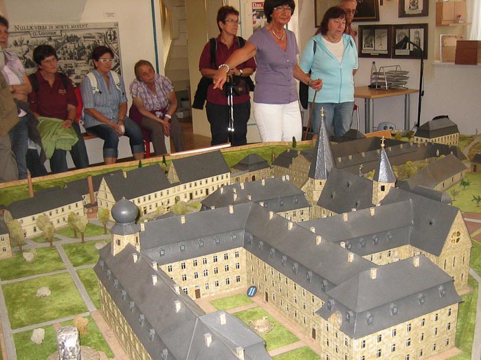 Dann wurde zum Aufbruch geblasen. Unser nächstes Ziel war Mistelfeld. Dieser Ort macht einen gepflegten Eindruck. Selten sahen wir schönere blühende Vorgärten oder Balkone.Der Paul (Klauer) hatte schon länger gemurrt, dass es kein Bier gab. Jetzt kam seine Zeit. An der Sportplatz-Gaststätte wurde mit einigen Maß Bier der Durst gelöscht. Frisch gestärkt ging es dann nach Klosterlangheim. Dort wartete bereits unser 2. Vorstand und Verpflegungsfahrer Gerd (Säger). Er hatte alles mitgebracht, was man zum Kaffee trinken braucht. Leckeren Kuchen, besorgt von Edeltraud (Kühl), Kaffee und Tee. Selbst einen Rosenstrauß für den Tisch hatte er nicht vergessen.Danach besuchten wir ein kleines Museum im Ort. Dort ist ein großes Modell der barocken Klosteranlage aufgebaut. Ende des 18. Jahrhunderts erreichte das Kloster seine höchste Blüte. Im Besitz waren unter anderem 19.215 Tagwerk Felder, 5.095 Morgen Wiesen und Gärten. 10.387 Morgen Wald. 269 Höfe, Huben und Mühlen. 20 Zehntscheunen und 4 Brauereien. Bauzeugen der Abtei Langheim sind bis heute der Langheimer Hof in Bamberg auf dem Domberg, die Basilika Vierzehnheiligen oder der Mönchshof in Kulmbach. Die einstige Pracht wurde dann im Laufe der Säkularisation zerstört. Gebäude und Liegenschaften wurden vom Staat versteigert oder verkauft. Große Teile der Klosteranlage wurden als Steinbruch genutzt und abgerissen. Die Geschichte der Zisterzienser in Langheim findet damit ihr Ende. Sehr beeindruckt verließen wir das Museum in Richtung Bad Staffelstein. In einem Landgasthof, bei einem guten Essen klang der Tag aus.